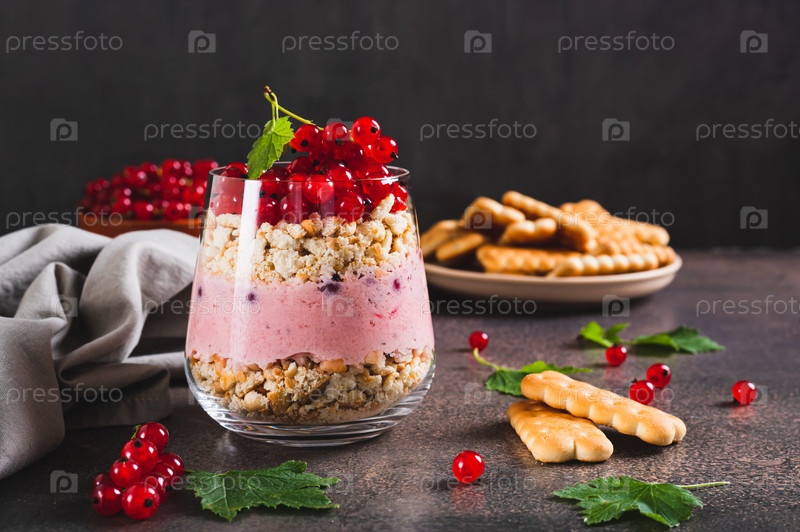 Сырный торт с красной смородиной в стакане на столе