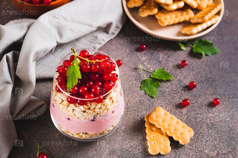 Традиционный десерт с печеньем и красной смородиной в стакане на столе