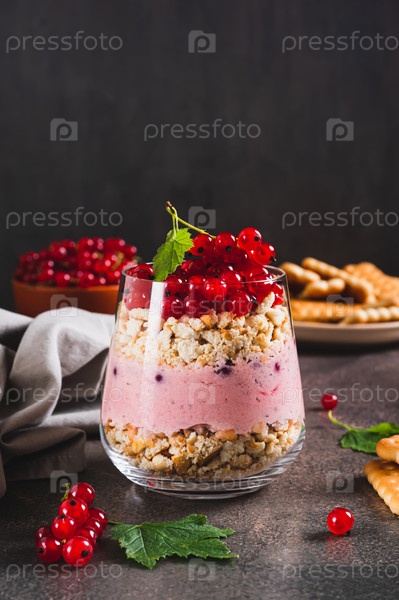 Сырный торт с красной смородиной в стакане на столе вертикальный вид