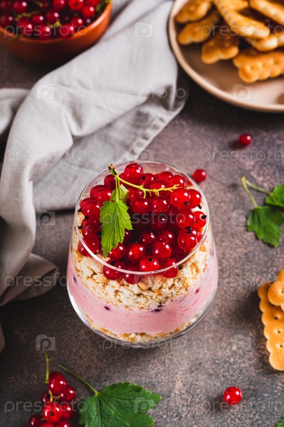Традиционный десерт с печеньем и красной смородиной в стакане на столе вертикальный вид