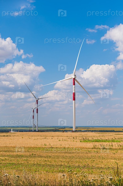 Ветряная электростанция на поле против голубого неба с облаками в летний день вертикальный вид