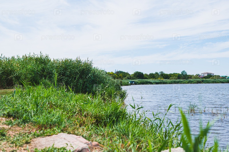 Дикий берег реки с высокой зеленой травой в солнечный летний день