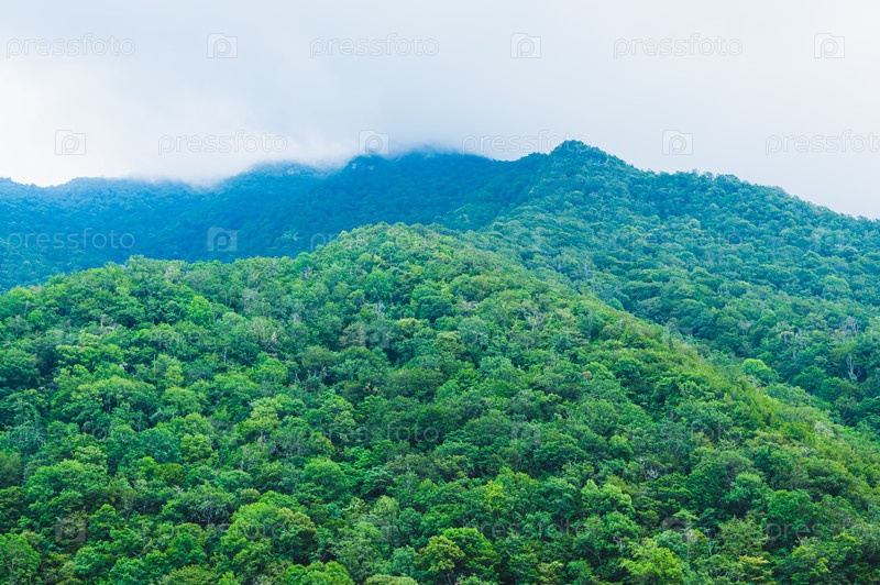 Горные вершины покрыты густым зеленым лесом в тумане