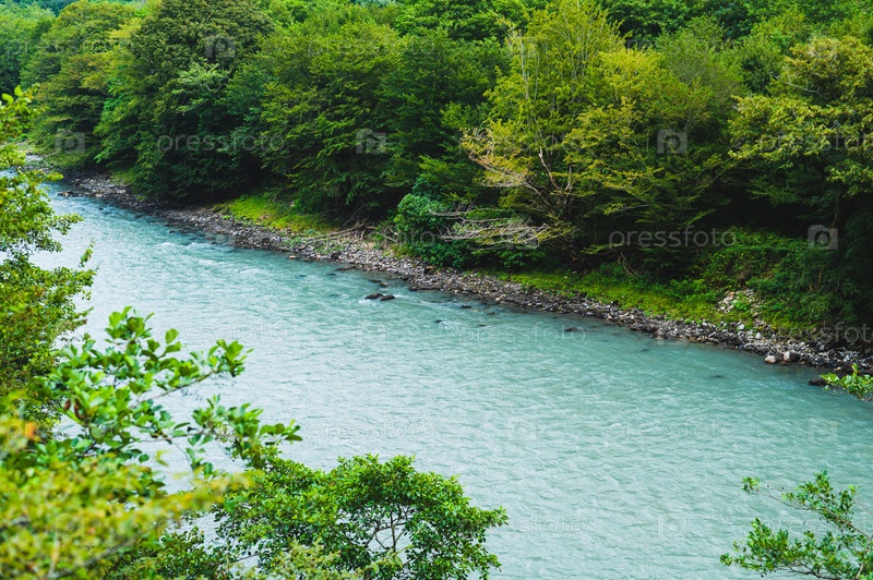 Быстрая горная река с голубой водой между лесистыми склонами в летний день