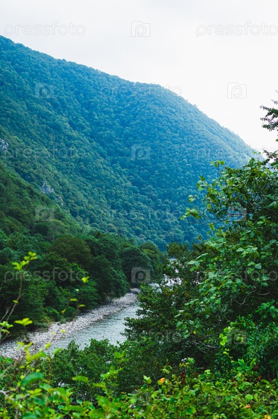 Быстрая горная река с голубой водой между лесистыми склонами вертикальный вид