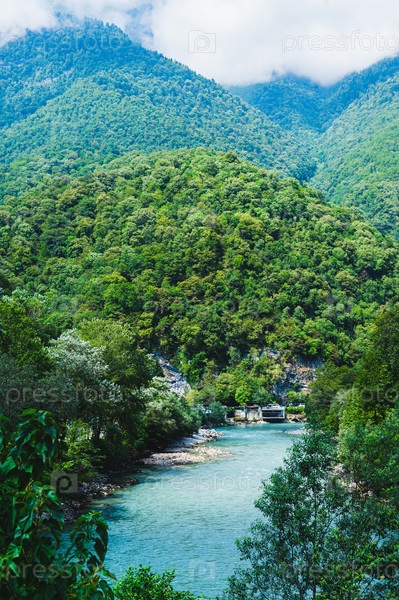 Голубая прозрачная река в горах среди лесов и гор вертикальный вид