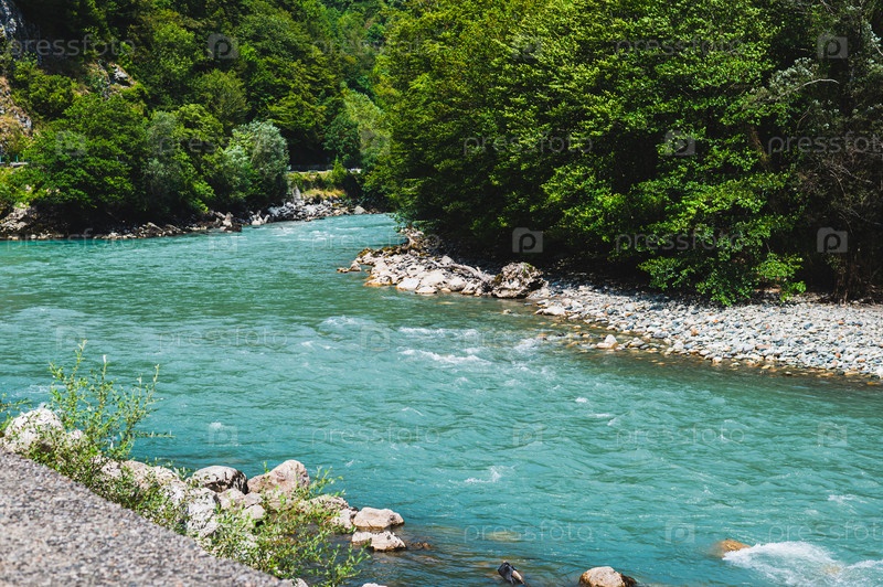 Прекрасный вид на изгиб в прозрачной горной реке с каменистыми берегами и деревьями