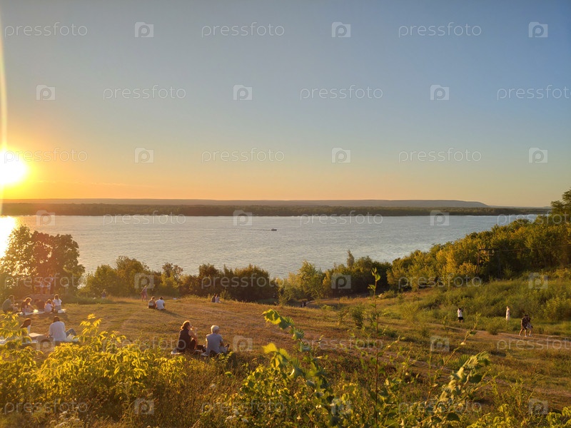 Заходящее солнце над Волгой. Люди отдыхают в природе. Красивый, спокойный пейзаж