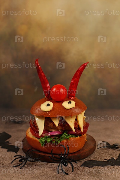 Концепция еды на Хэллоуин. страшные гамбургеры со свежим салатом, помидорами, сливочным сыром, салатами, луками, пирожными и перцем в форме рогов на старом бетонном фоне, рекламное кафе