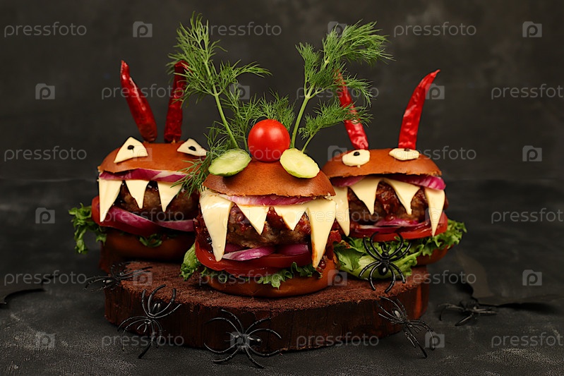 Концепция еды Хэллоуина: страшные гамбургеры со свежим салатом, помидорами, сливочным сыром, салатами, луками, пирожными и перцем в форме рогов на старом бетонном фоне, реклама кафе, меню