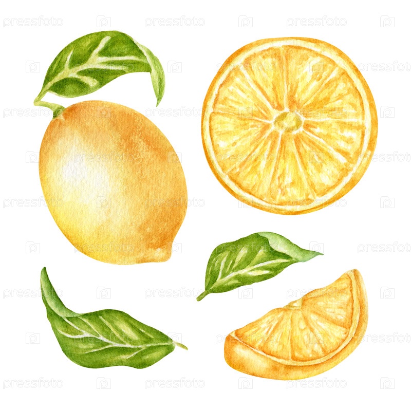 Набор акварельных лимонов для дизайна: цитрусовые, ветви, листья и половины лимона