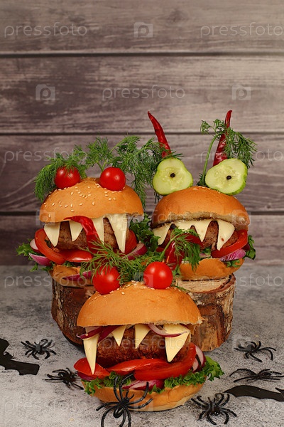 Концепция еды Хэллоуина: страшные гамбургеры со свежим салатом, помидорами, сливочным сыром, салатами, луками, пирожными и перцем в форме рогов на старом бетонном фоне, рекламные кафе, меню