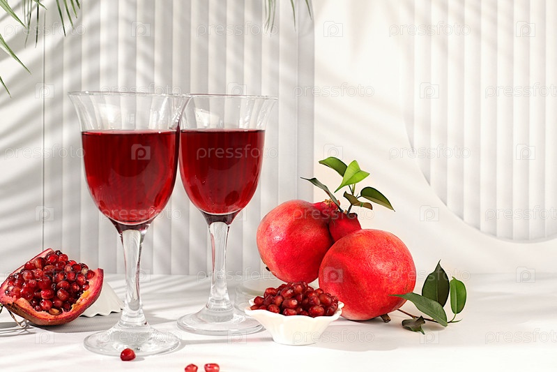 Стаканы красного вина и зерна из граната с спелыми гранатами на модном столе с пальмовыми оттенками, концептуальная праздничная вечеринка, реклама бара и кафе. Источник витаминов для здорового образа жизни,