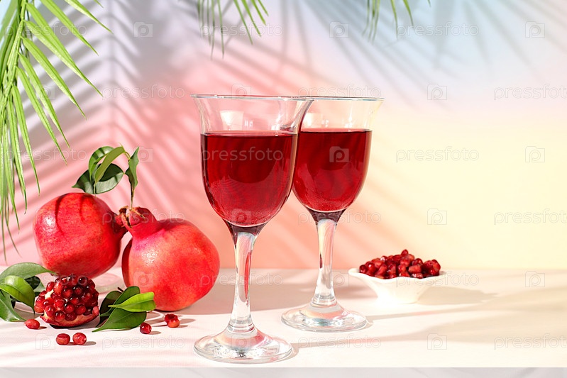 Современный натюрморт с красным вином из граната и зернами со зрелыми гранатами на модном столе в тени пальм, концептуальная праздничная вечеринка, реклама бара и кафе