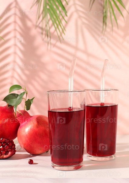 Напиток с соком граната и его ингредиенты, богатый напиток из граната на элегантном солнцезащитном столе, детоксикационная диета и концепция похудения, натуральная пища для здорового образа жизни, источник витамина С