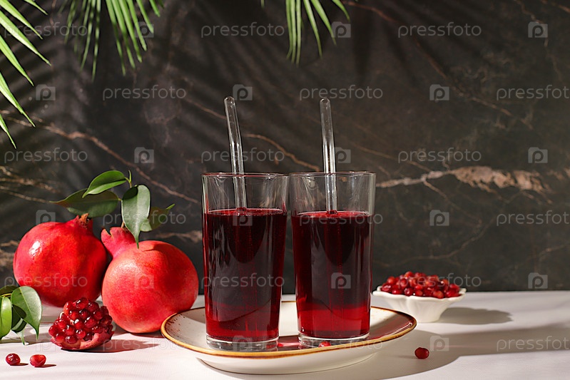 Напиток с соком граната и его ингредиенты, богатый напиток из граната на элегантном солнцезащитном столе, детоксикационная диета и концепция похудения, натуральная пища для здорового образа жизни, источник витамина С