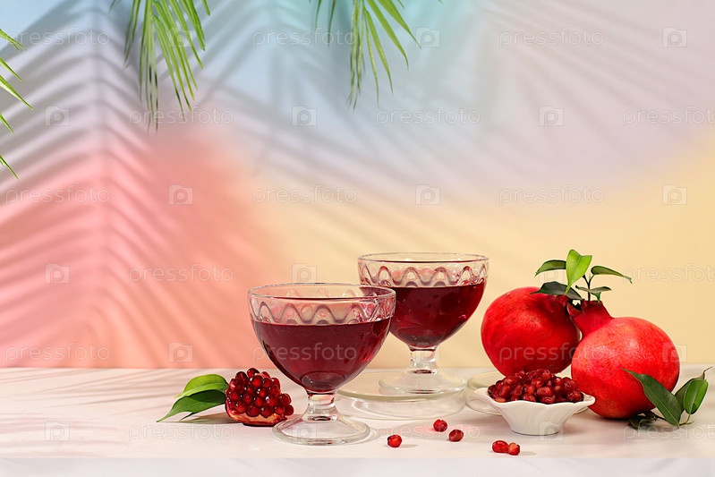 Красное вино из граната и зерна со зрелыми гранатами на модном столе с пальмовыми оттенками, концептуальная праздничная вечеринка, реклама бара и кафе. Источник витаминов для здорового образа жизни,