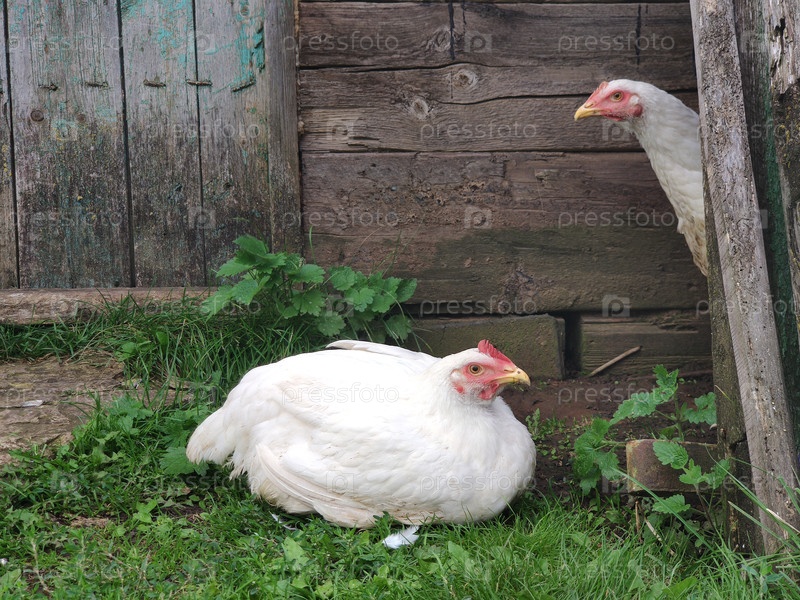 Курица и петух гуляют по деревне на зеленой траве