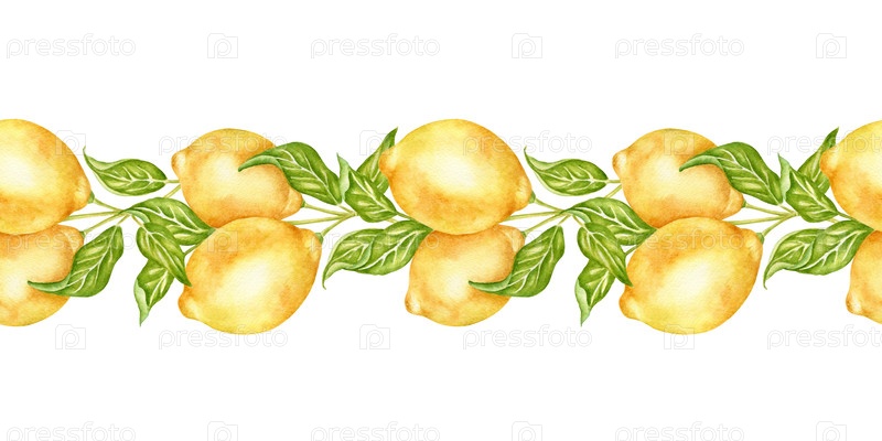 Акварель представляет собой бесшовную границу с лимонными фруктами и зеленью