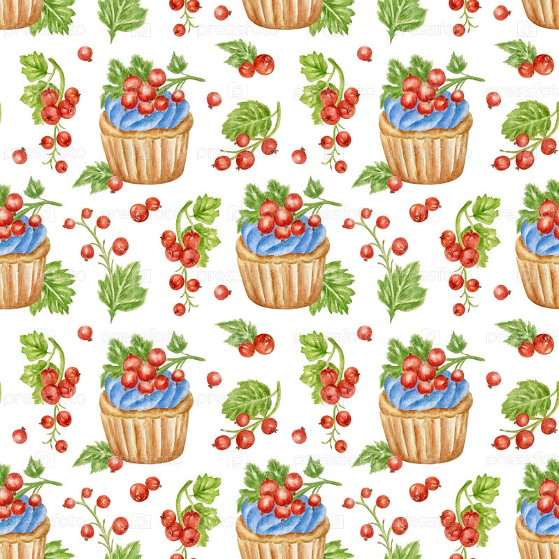 Яркий, бесшовный рисунок с красными ягодами смородины и праздничными кексами ручной живописи в аквареле
