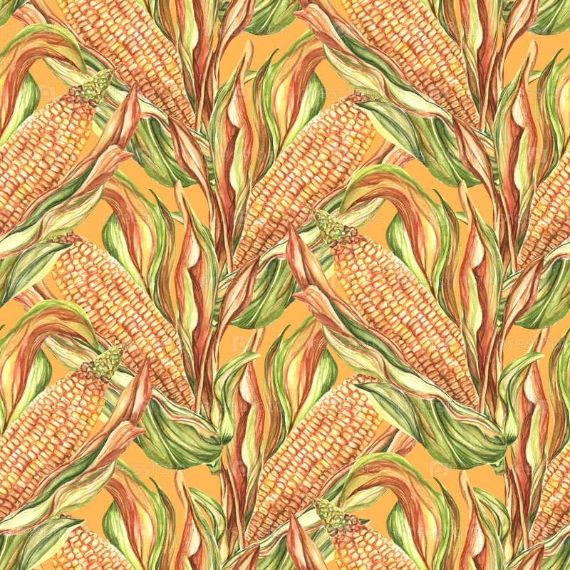 Акварельный бесшовный рисунок с кукурузными хлопьями и листьями, яркий сочный овощный фон