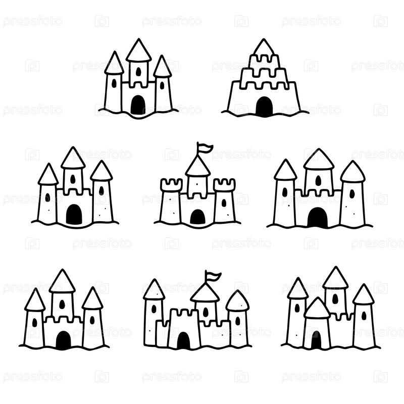 Набор песчаных замков в стиле doodle. ручной рисунок, векторная иллюстрация на белом фоне