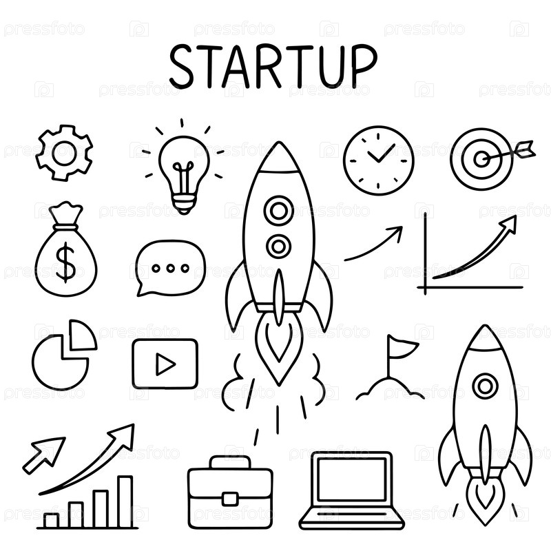 Набор векторных икон стартапа Рост стартапов, разработка и запуск значков в стиле doodle Иллюстрация вектора
