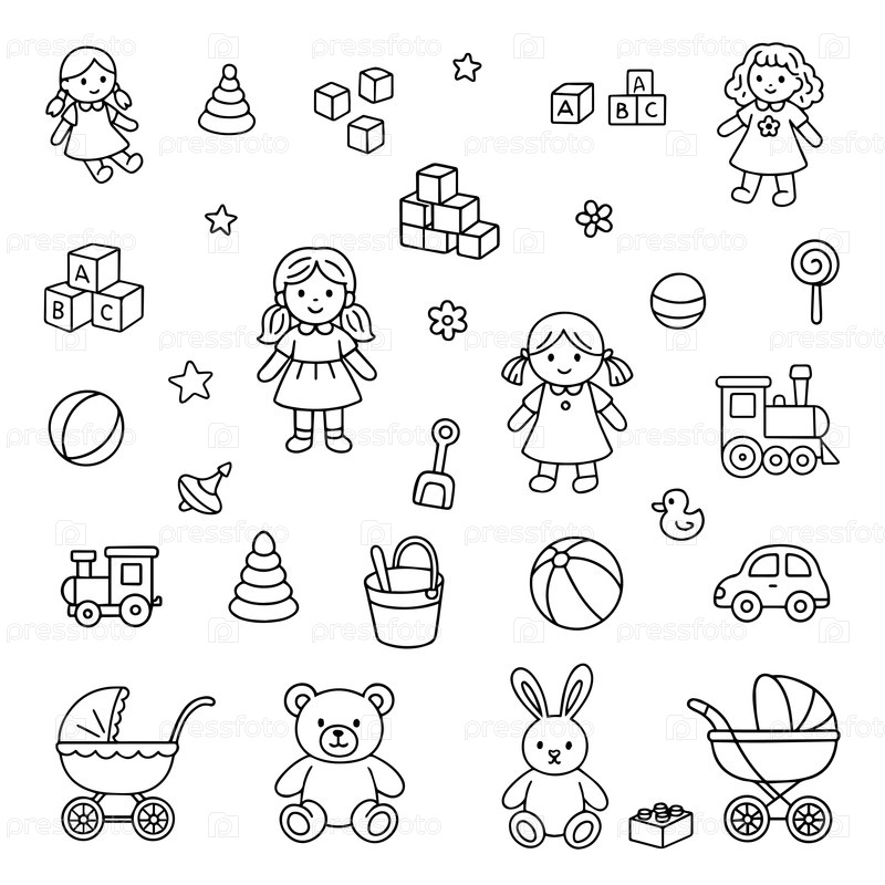 Черно-белая векторная иллюстрация с различными детскими игрушками, включая куклы, блоки, шары и плюшевых медведей, расположенных в игривом узоре, подходящем для окрашивания