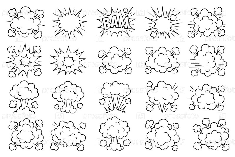 Набор иллюстраций взрывчатых и дымовых облаков в различных формах, идеально подходит для графического дизайна и анимационных проектов