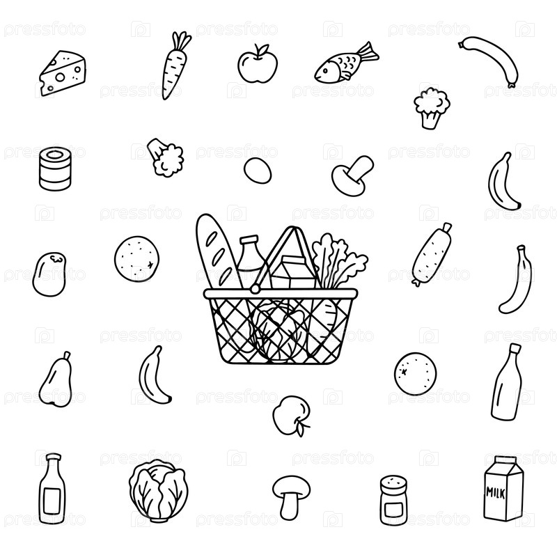 Корзина заполнена различными продуктами, окруженными отдельными товарами, такими как фрукты, овощи, напитки.Векторная иллюстрация в стиле doodle на белом фоне