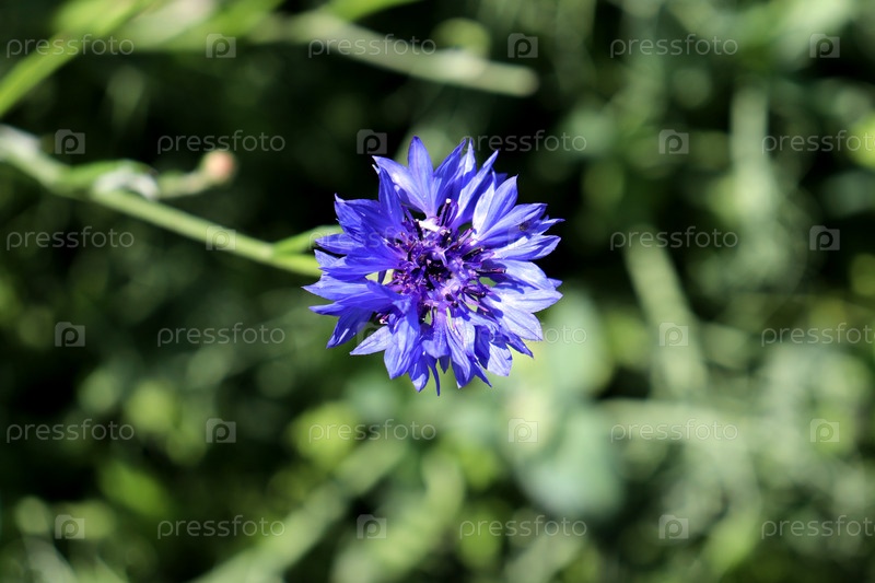 Один садовой голубой кукурузный цветок в солнечный летний день среди травы