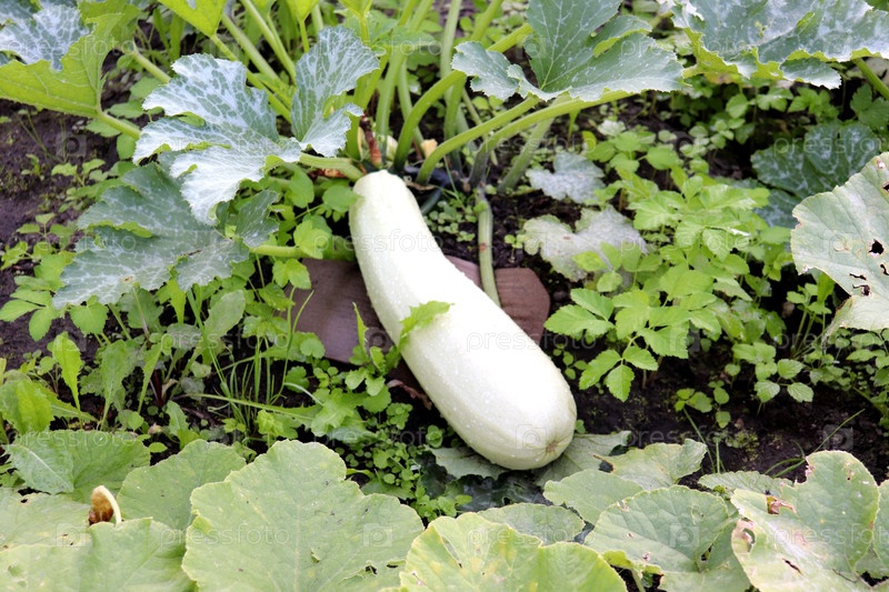 Удлиненные белые кабачки созревают на кровати летом вечером в саду