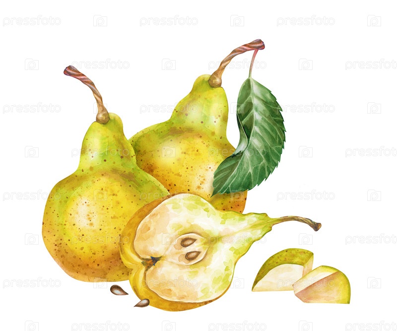 Акварельная композиция с грушами, нарисованная вручную. Целые груши, половинки и нарезанные куски фруктов. Ботаническая иллюстрация выделена на белом фоне. Для кулинарного блога и материалов о здоровом образе жизни