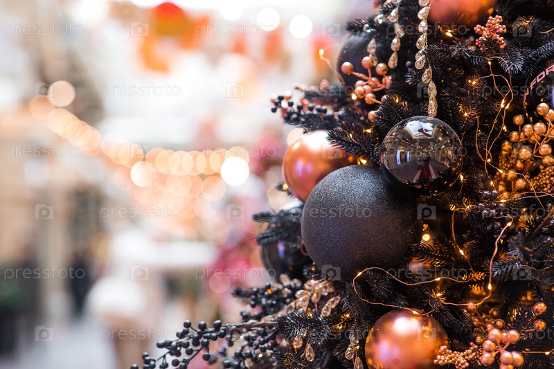 Стильные праздничные черные игрушки на рождественской елке в Москве.Концепция подготовки и украшения для Нового 2026
