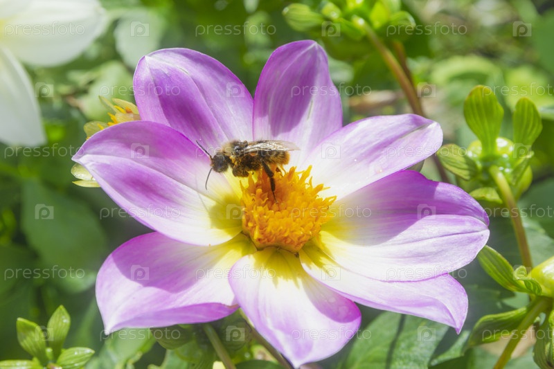 Пчела сидит на цветке георгины, она собирает нектар из розового цветка