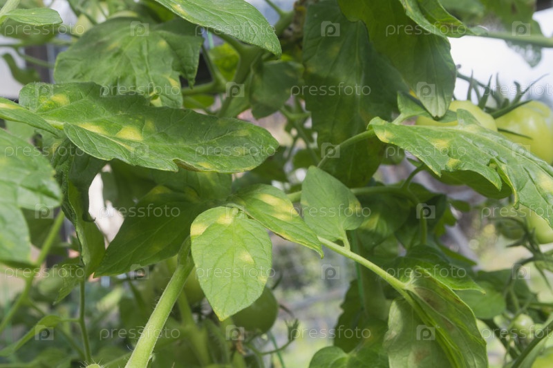 Зеленые листья томатного куста с желтыми пятнами являются признаком поздней болезни