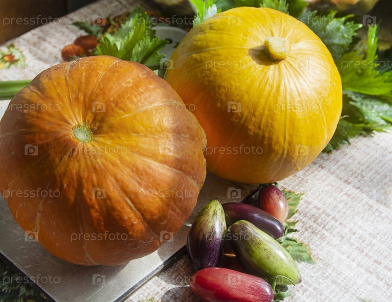 Желтые и оранжевые тыквы, сливные помидоры и зелень образуют натюрморт