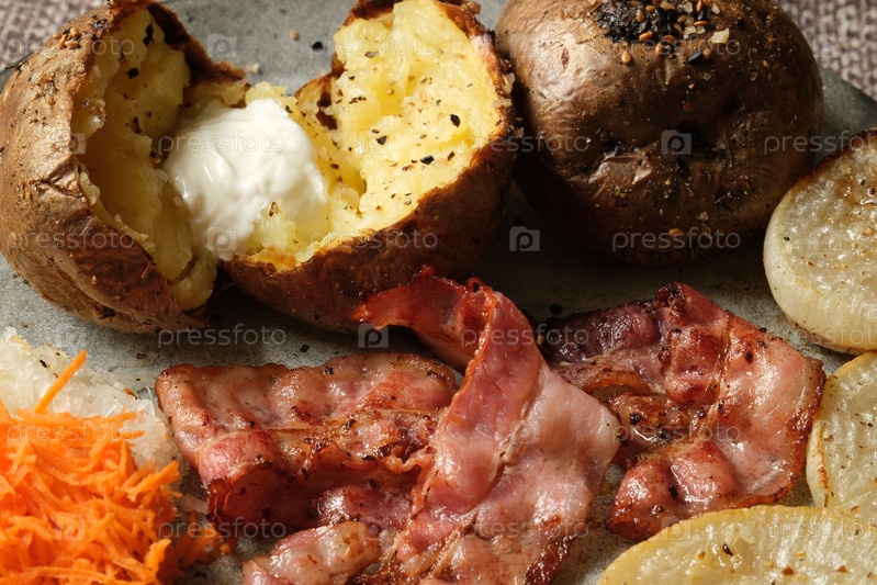 Выпеченный картофель Jacket с беконом, редисом и овощами подается на тарелке