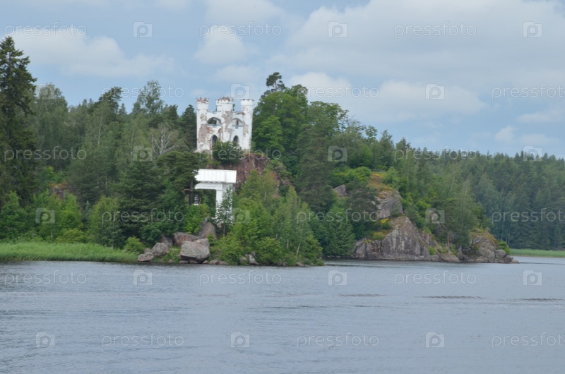 Вид на Капеллу Людвигсбурга на острове Людвигштейн и Храм Нептуна в Заливе защиты у особняка Монрепо недалеко от Выбора