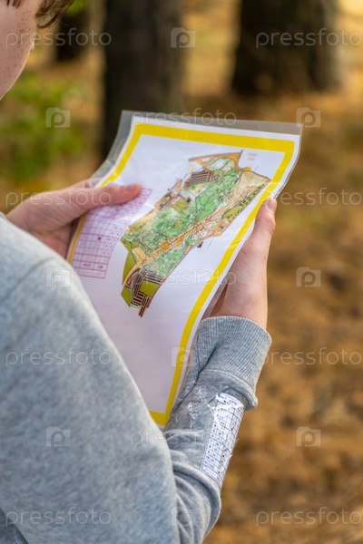 Спортсмен, держащий карточку во время соревнований по ориентированию, использует навигационное оборудование для ориентации и топографической карты