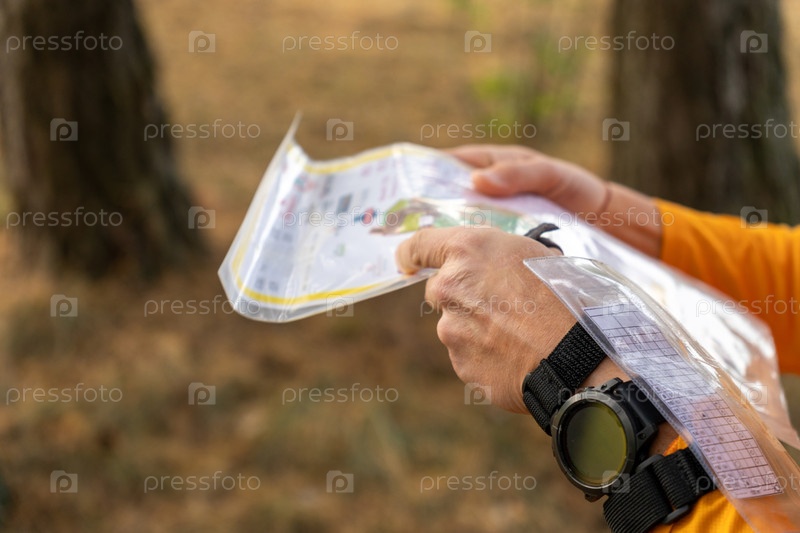 Спортсмен, держащий карточку во время соревнований по ориентированию, использует навигационное оборудование для ориентации и топографической карты