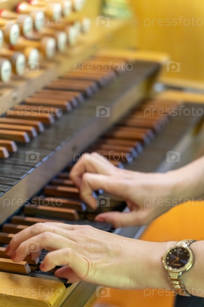 Музыкант играет на древнем деревянном органе в спокойной лютеранской церкви, ее руки грациозно движутся по клавишам