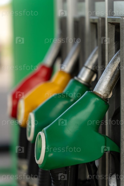 Ближайшее изображение четырех топливных насосов на бензоколонке, готовых к заправке. детальный обзор современного оборудования автозаправочных станций