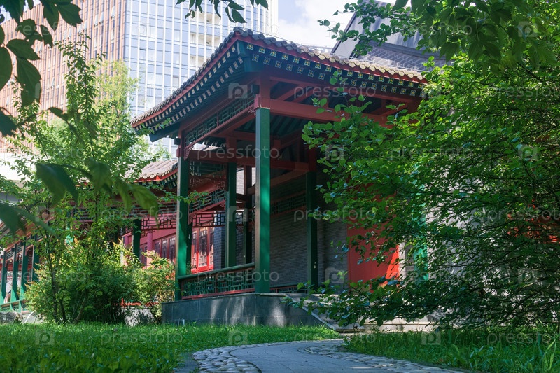 Традиционная китайская архитектура на фоне современных офисных зданий