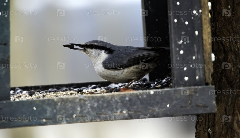 Небольшая птица является помехой на кормилице для птиц