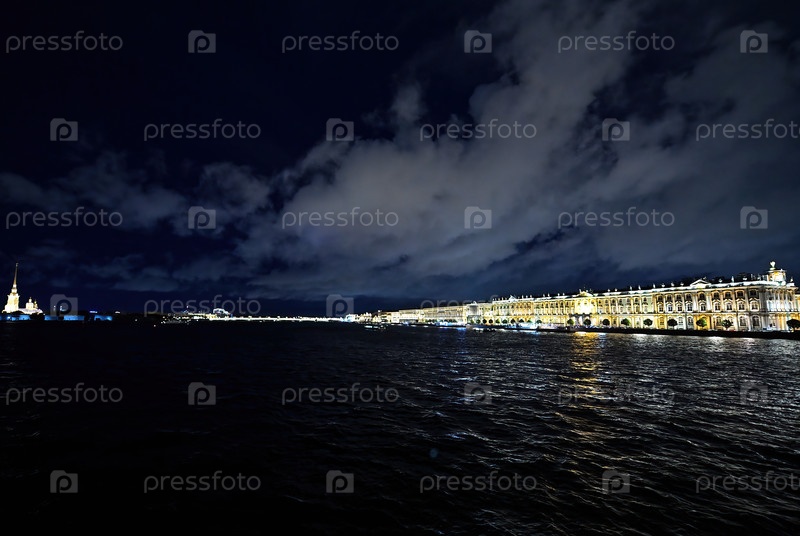 Вид на Зимний дворец и крепость Петра и Павла ночью через Нуву