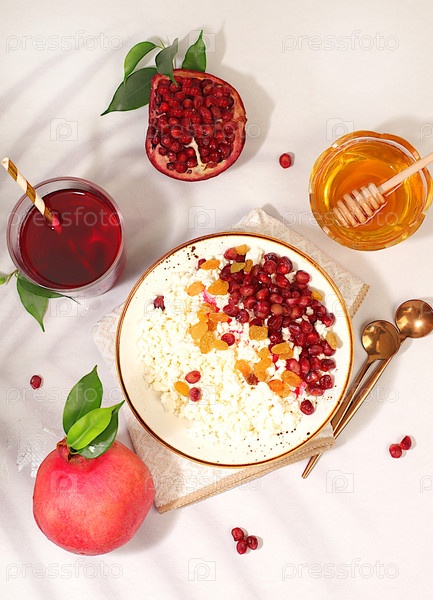 Мягкий зернистый коттеджный сыр с семенами граната, изюмом, медом и соком на солнечном столе, концепция натуральной пищи, реклама здорового образа жизни, детское питание