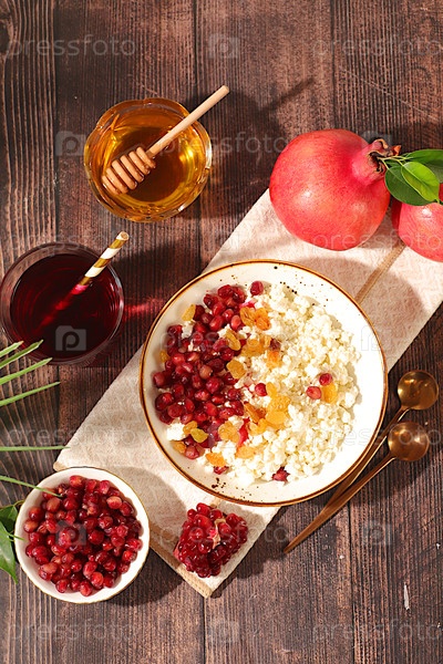 Мягкий зернистый коттеджный сыр с семенами граната, изюмом, медом и соком на солнечном столе, концепция натуральной пищи, реклама здорового образа жизни, детское питание
