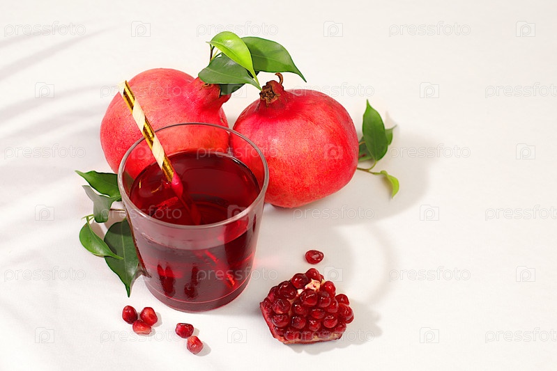 Напиток с соком граната и его ингредиенты, богатый напиток из граната на элегантном солнцезащитном столе, детоксикационная диета и концепция похудения, натуральная пища для здорового образа жизни, источник витамина С