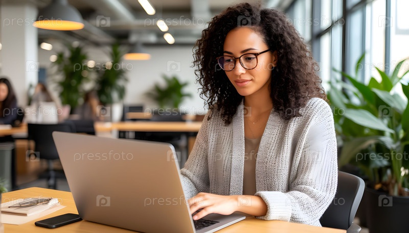 Фотореалистичное изображение женщины с ноутбуком в коворкинге